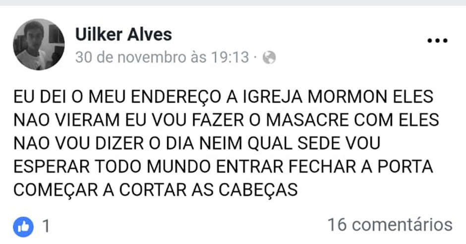 A PM informou ainda que o agressor já havia feito ameaças à igreja em sua página no Facebook e que ele cumpria pena em regime aberto por lesão corporal. Além disso, Uilker também possui passagens policiais por resistência à prisão e desacato à autoridade.