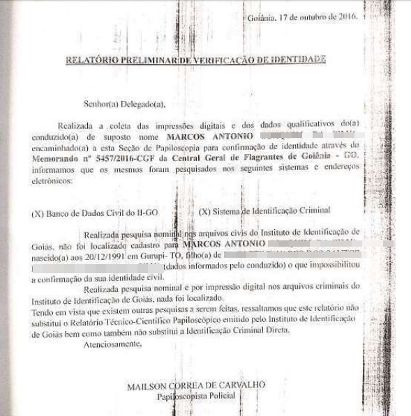 De acordo com a advogada Crislayne Fernandes, no relatório preliminar de verificação de identidade, o papiloscopista responsável pelo documento afirma que os dados informados em nome de Marcos Antônio não foram encontrados no sistema de buscas por nomes e digitais do Instituto de Identificação de Goiás. Segundo o perito, tal fato “impossibilitou a confirmação da identidade civil”. Para a advogada, houve erro do Poder Judiciário.