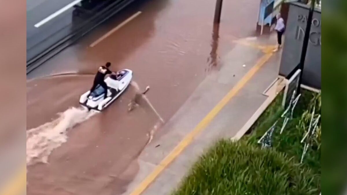 O volume de chuvas que caiu em Goiânia, nesta tarde de quarta-feira (27), criou situações inusitadas. Entre elas, um homem foi flagrado utilizando um jet-ski na Rua 87, no setor Sul.