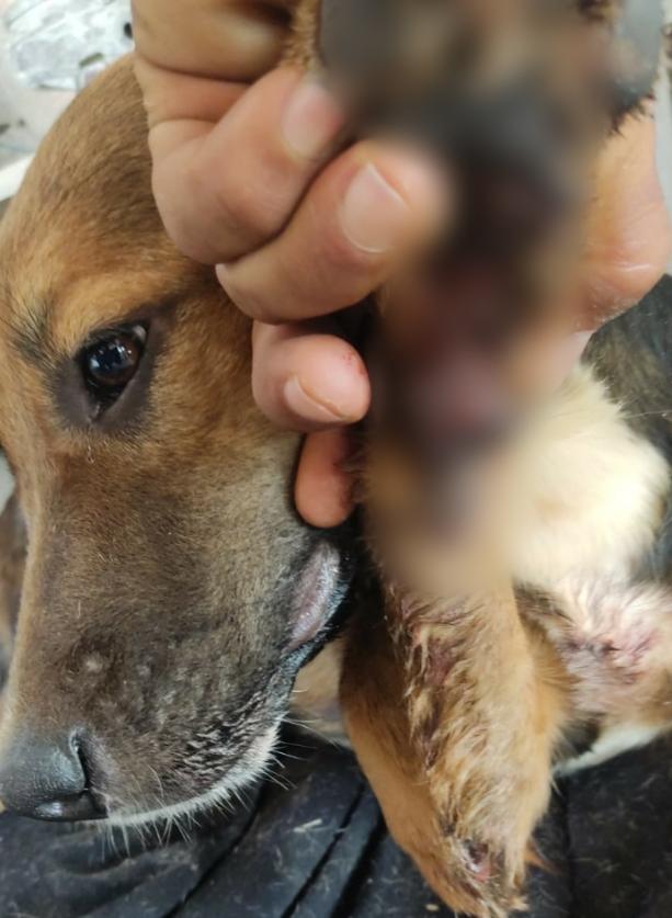 Cadela apresentava ferimentos pelo corpo e apresentava sangramento nas patas. Ela recebeu atendimento de veterinários e foi adotada por uma das pessoas que a resgatou