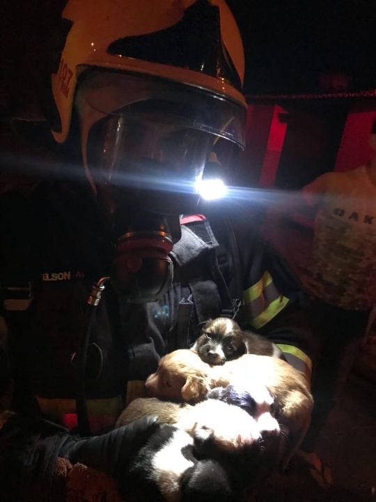 “Ele mora sozinho e tinha muito entulho no recinto. Ele estava encolhido junto à parede, acompanhado por cinco filhotes de cachorro, que também foram salvos”, destaca.