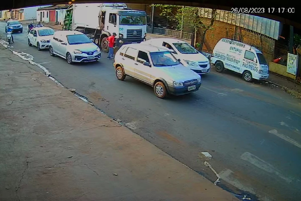 Câmera de segurança registrou o momento. Na gravação é possível ver Alfredo Júlio do Nascimento, que é conhecido como Alfredinho das Latinhas, andando pelos carros e pedindo moedas no sinaleiro da via.