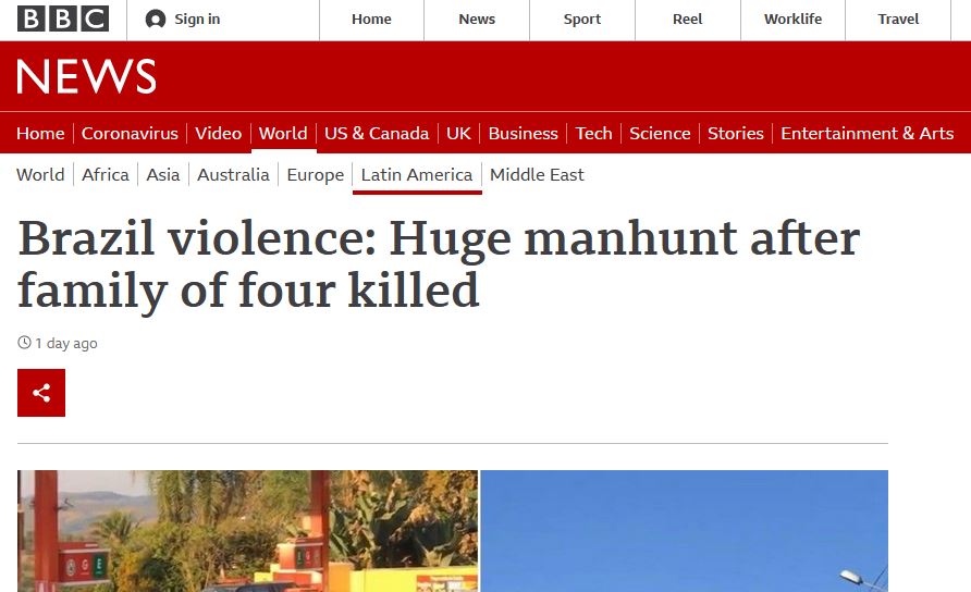 Na matéria da BBC, intitulada Brazil violence: Huge manhunt after family of four killed (algo como “Grande caçada após assassinato de uma família de quatro pessoas”), o veículo em sua versão inglesa descreve a forte operação montada para procurar Lázaro, com helicópteros e centenas de policiais percorrendo possíveis esconderijos do acusado em áreas rurais.