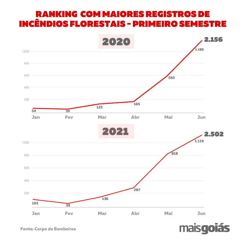 Ainda segundo as estatísticas divulgadas pelos bombeiros, a partir de março a quantidade de queimadas florestais aumentam descontroladamente em Goiás. Para se ter uma noção, em março de 2021 os bombeiros atenderam 136 incêndios no Cerrado, em maio o número já era de 818 ocorrências e em junho atingiu a marca de 1.119 atendimentos.