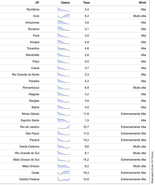 Abaixo de Goiás, aparecem o Mato Grosso do Sul e o Paraná, ambos com taxa de 14,2. A Fiocruz apontou que os estados do Mato Grosso, Santa Catarina, Rio Grande do Sul, Pernambuco e Acre apresentam taxas de incidência inferiores, porém ainda acima de 5 casos por 100 mil habitantes (muito alta). Segundo a entidade, como a vigilância de SRAG tem o foco nos casos graves de infecção respiratória com sintomas que levam à hospitalização, ou mesmo a óbito, “tais taxas permanecem preocupantes”.