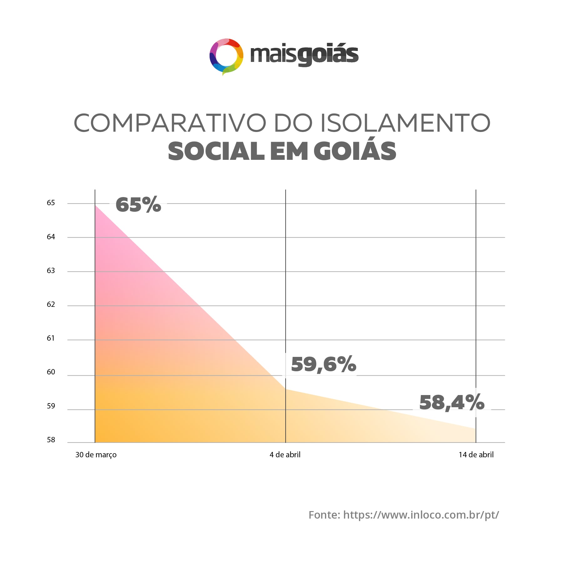 O Estado de Goiás registrou nova queda no índice de isolamento social determinado pelo governo estadual em razão da pandemia do novo coronavírus. Percentual já chegou a 65% no dia 30 de março, mas dados mais recentes, do dia 14 de abril, apontam registros de 58,46%. Apesar da queda, goianos ainda lideram o ranking nacional e estão acima da média de outras unidades federativas.