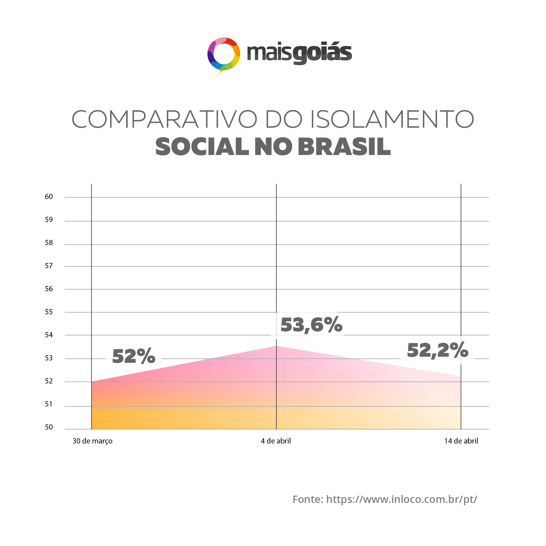 Em março deste ano, Goiás registrou seu maior índice desde o início do isolamento, com 65%. Um dia depois, o registro era de 63%, ainda acima da média de 60%. No dia 4 de abril, no entanto, o Estado teve queda e foi para 59,6%. Entre os dias 10 e 13 de abril, Goiás chegou a perder o posto para o Distrito Federal (DF). Nesse período, o Estado registrou isolamento de 50,22% da população, contra os 55,9% registrados pelo DF; a posição, porém, já foi recuperada.