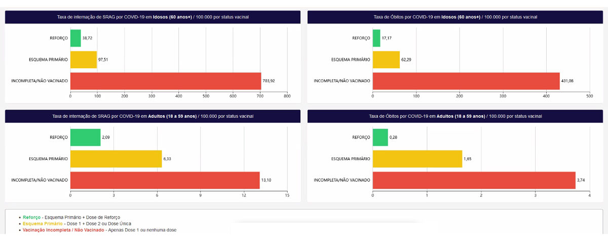 Para o grupo de 60 anos ou mais são internados 38,72 a cada 100 mil quando já estão com reforço; 97,51 com esquema primário; e 703,92 quando não vacinados ou com uma só dose. Para a mesma faixa de idade, mas em relação a óbitos, 17,17 para 100 mil quando com reforço; 62,29 no esquema primário; e 431,08 se não vacinado ou com uma só dose.