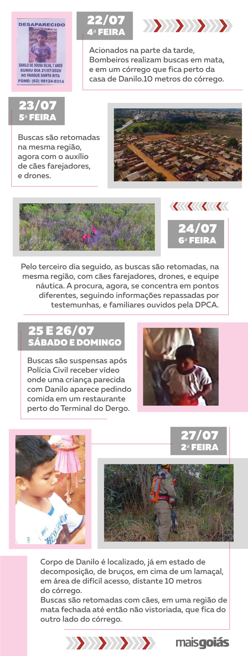 Informações desencontradas, segundo o Corpo de Bombeiros, prejudicaram as buscas ao pequeno Danilo de Sousa Silva, de sete anos, que desapareceu na terça-feira (21) da semana passada, no Parque Santa Rita, em Goiânia. O corpo dele só foi encontrado, na tarde desta segunda-feira (27), depois que os Bombeiros deixaram de seguir informações repassadas por familiares e testemunhas, e resolveram averiguar uma área de mata fechada, localizada no mesmo setor, mas que fica do outro lado de um córrego. Veja como foram as buscas.