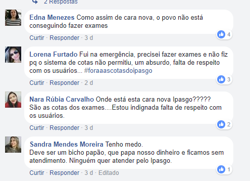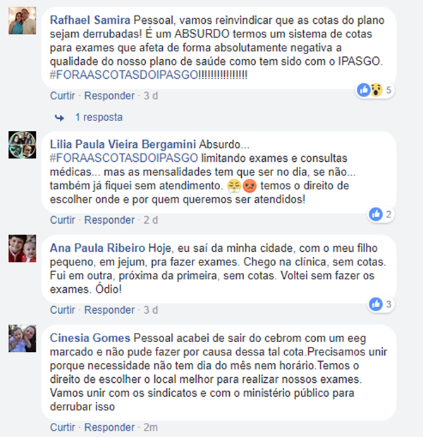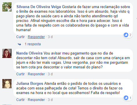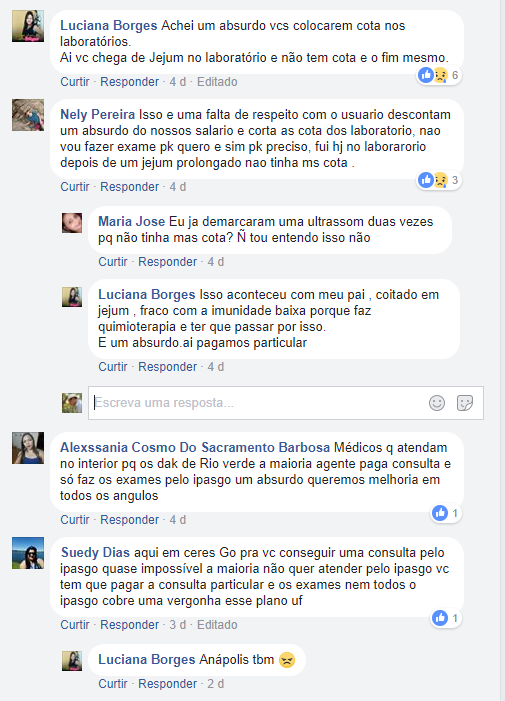 Pacientes que relatam já ter reclamado à ouvidoria, dizem que não tiveram respostas, e recorrem às redes sociais do Instituto para desabafar. “É um absurdo termos um sistema de cotas para exames que afeta de forma absolutamente negativa a qualidade do nosso plano de saúde como tem sido com o Ipasgo”, revela um dos pacientes que seguem a página oficial do Instituto.