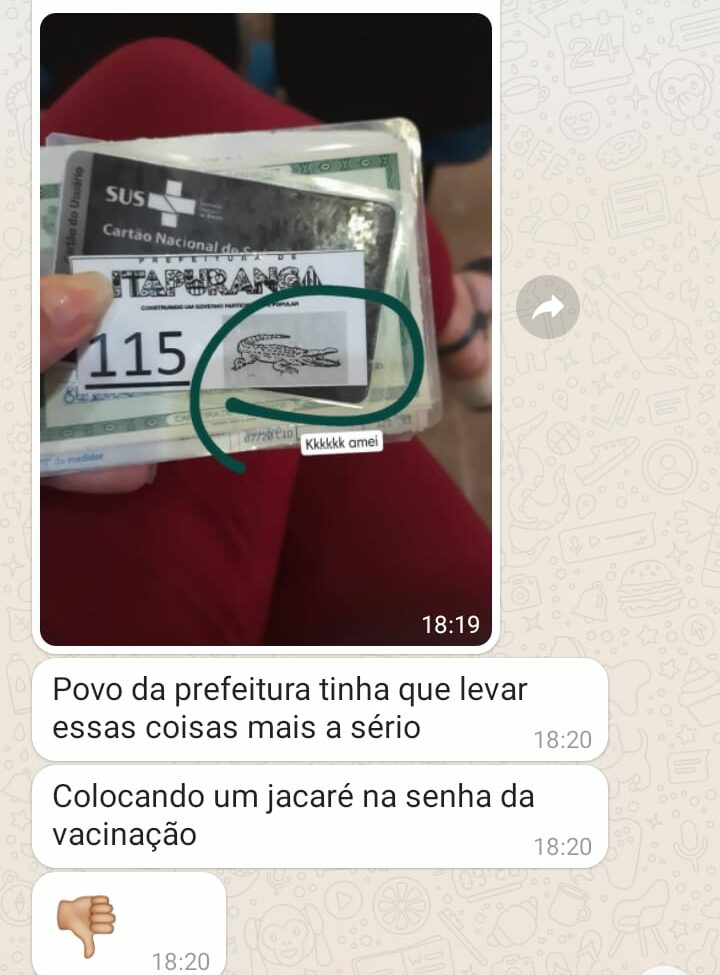 A Prefeitura de Itapuranga dividiu opiniões na campanha de vacinação contra Covid-19 na cidade. Isso porque as senhas distribuídas na quinta-feira (26) contavam com o desenho de um jacaré. O animal virou alvo de piada nas redes sociais no final de 2020, após fala do presidente Jair Bolsonaro sobre eventuais efeitos colaterais: “se você virar um jacaré, é problema seu”, disse ao fazer menção à vacina da farmacêutica Pfizer.