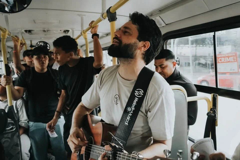 A ação, realizada no último dia 4 de fevereiro, foi organizada em menos de 12 horas. O grupo iniciou as atividades no Terminal Bandeiras e, em seguida, percorreu alguns ônibus do transporte coletivo da capital. Antes de cantar e compartilhar a mensagem, Allan explicou que os missionários pediam licença aos passageiros e perguntavam se poderiam “deixar uma canção para o coração deles”.