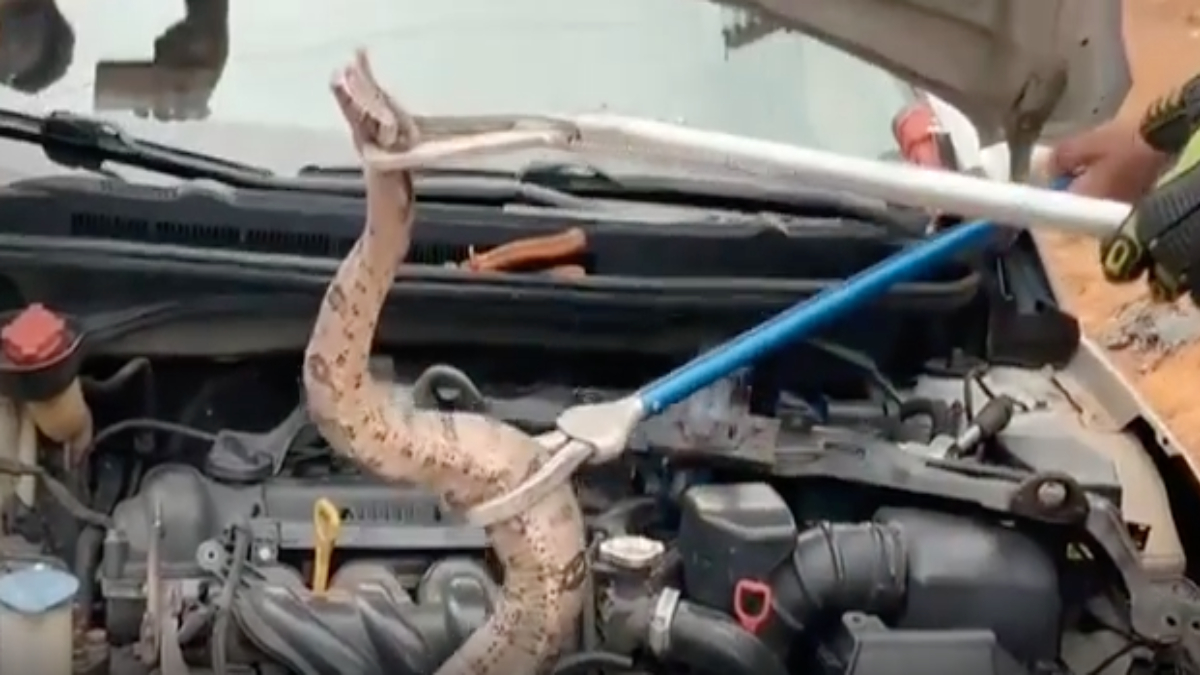 De acordo com os bombeiros, foi necessário acionar um mecânico para desmontar a parte da frente do veículo para que então a equipe pudesse realizar o resgate. A jibóia estava em bom estado de saúde, sem ferimentos.
