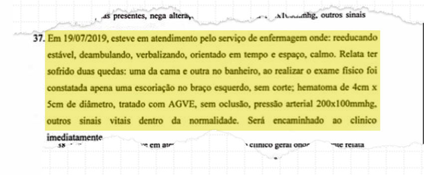 Um relatório feito pela própria DGAP destaca que, nos dias 3 e 19 de junho, o médium relatou que caiu da cama, no quarto e no banheiro. Ele ainda teria pedido para que fossem instaladas barras de segurança dentro do banheiro. Em outro trecho, o relatório destaca que, após a realização de exames, ficou constatado que o médium apresentou escoriações e alguns hematomas. Por isso, após audiência que ouviu seis testemunhas, a juíza do Fórum de Abadiânia decidiu que o médium seria interrogado por carta precatória.