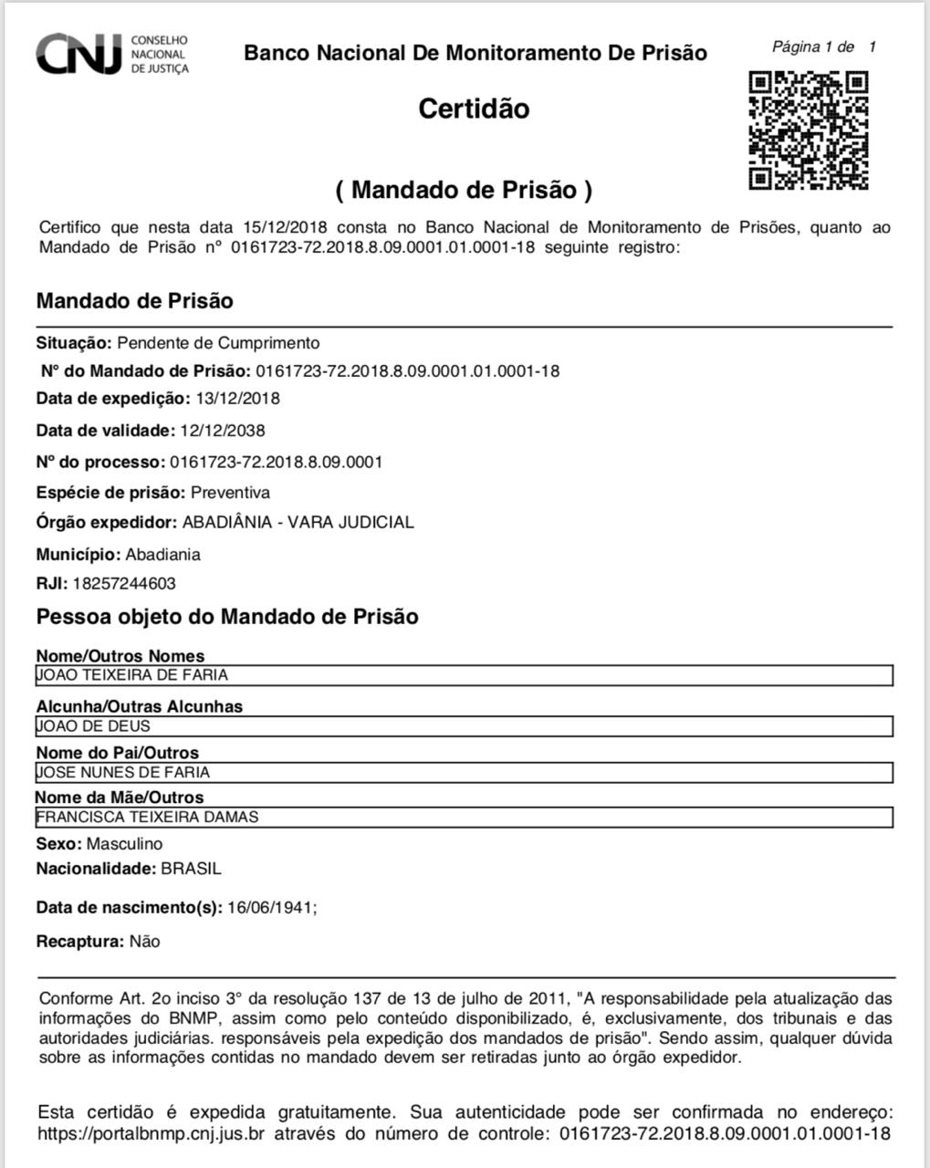 O MP também disponibilizou o mandado de prisão emitido pela Justiça a pedido do Ministério Público de Goiás, em desfavor do médium João Teixeira de Faria, mais conhecido como João de Deus. O documento teve seu sigilo derrubado e está disponível para conferência no site do Banco Nacional de Mandados de Prisão do Conselho Nacional de Justiça.