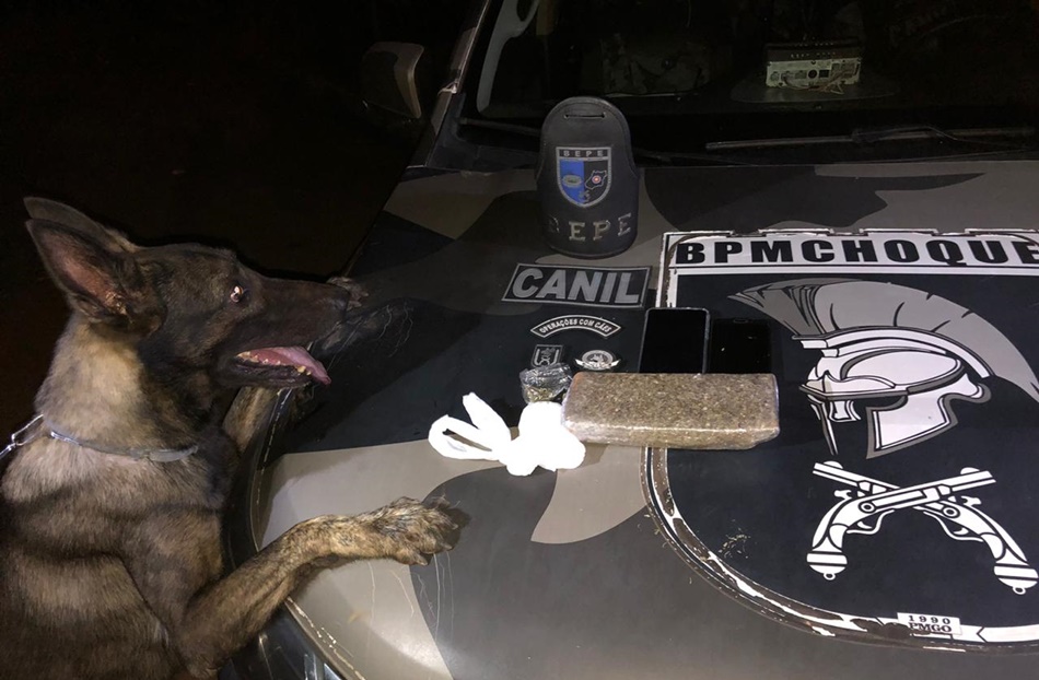 Os policiais pediram auxílio ao canil do Batalhão de Choque. O cachorro da polícia encontrou um tablete de aproximadamente um quilo de maconha e cerca de R$ 550 em notas. Ainda durante as buscas, a PM encontrou um tatu na geladeira e a carapaça debaixo da pia.