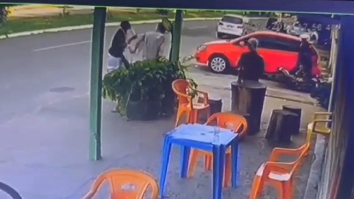 Imagens de câmera de monitoramento registraram o momento do crime. A vítima chega de moto, o que gera inquietação em três homens que estão no local.