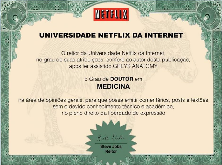 Falar que é “formado em x temporadas de Grey’s Anatomy” é uma brincadeira comum entre os fãs da série. A Netflix, inclusive, resolveu entrar na onda dos telespectadores da trama médica e disponibilizou em seu Facebook um “diploma” que “certifica” quem já assistiu a todas as temporadas do seriado.