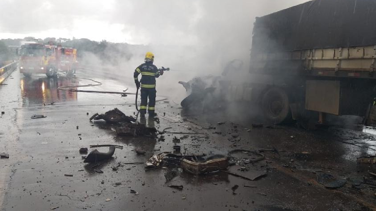 De acordo com o Corpo de Bombeiros, o motorista de uma carreta que transportava grão tentou realizar uma ultrapassagem na cabeceira de uma ponte, mas perdeu o controle e bateu de frente com o outro veículo, que começou a pegar fogo.