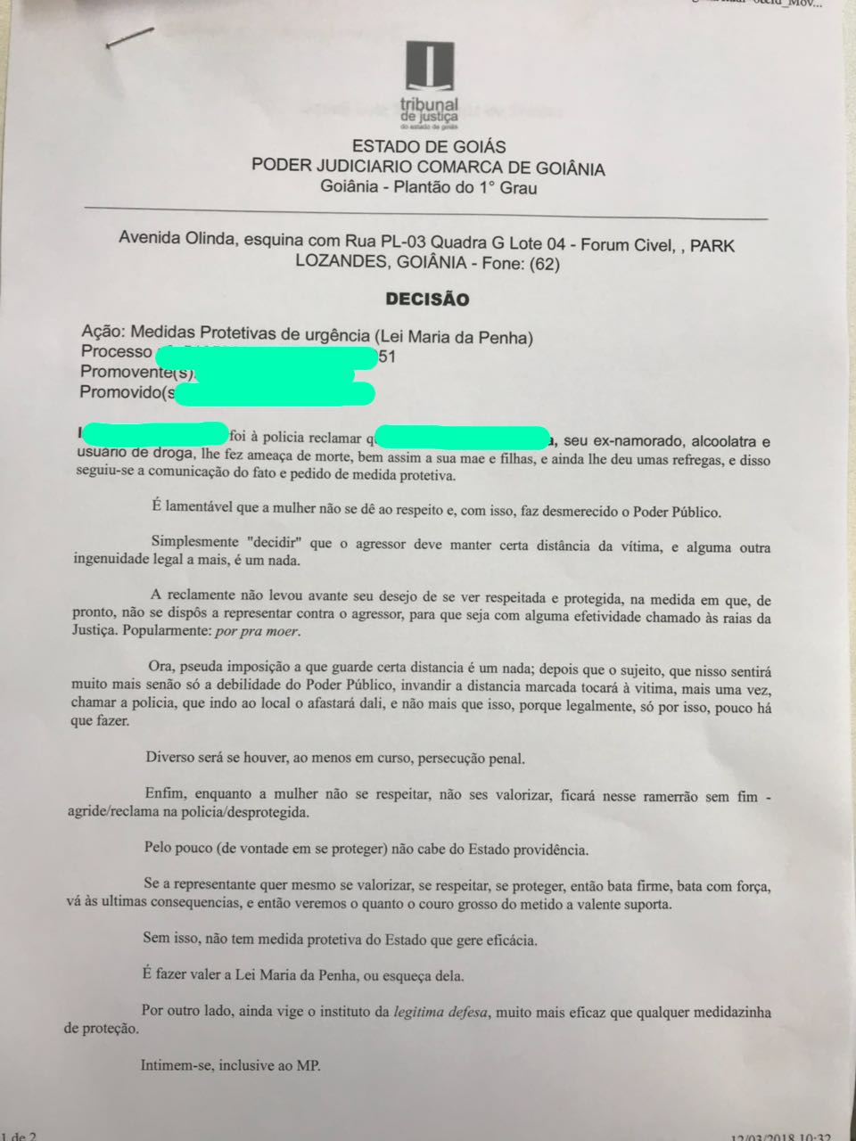 Depois que seu companheiro a ameçou de morte, uma mulher teve o pedido de medida protetiva negado pelo juíz de Direito Joseli Luiz Silva, da 3° Vara Cível de Goiânia. A decisão, proferida no último sábado (10), gerou polêmica porque o magistrado utilizou em sua sentença termos chulos, juízo de valores e justificativas que desqualificam a vítima. No texto, ele chega a afirmar que ” é lamentável que a mulher não se dê o respeito e, com isso, faz desmerecido o Poder Público”.