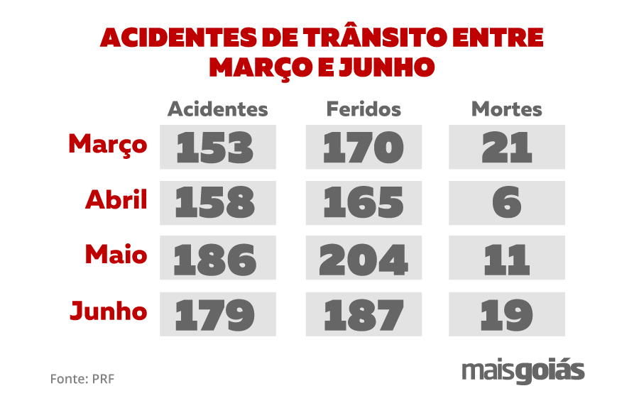 Conforme dados da PRF, pelo menos 19 pessoas morreram e outras 191 ficaram feridas nas BRs goianas durante o mês de junho, a segunda maior média de mortes do período analisado. O mês com o maior número de óbitos foi março, com 21 mortes e 170 feridos.