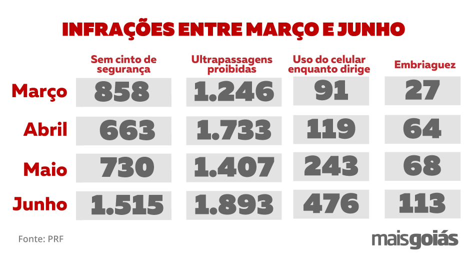 O mês de junho registrou a maior quantidade de infrações de trânsito dos últimos quatro meses, nas rodovias federais que cortam o Estado de Goiás. Levantamento feito pelo Mais Goiás, com base nos boletins diários enviados pela Polícia Rodoviária Federal (PRF), mostra que, no mencionado mês, ao menos 3.997 motoristas foram autuados por ultrapassagens indevidas, falta do uso do cinto de segurança, embriaguez ao volante e o uso de celulares durante a direção.