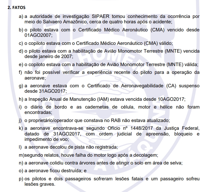Ainda conforme a investigação, uma ordem de apreensão, bloqueio e impedimento de voo para a matrícula do avião havia sido emitido pela Justiça Federal, no final de agosto de 2017. A habilitação de Avião Monomotor Terrestre também estava com prazo vendido desde 2007. A mesma documentação do copiloto, no entanto, não apresentou nenhuma irregularidade. Não foi possível levantar as horas totais de voo da aeronave, pois o diário de bordo e as cadernetas de célula, motor e hélice não foram encontrados.