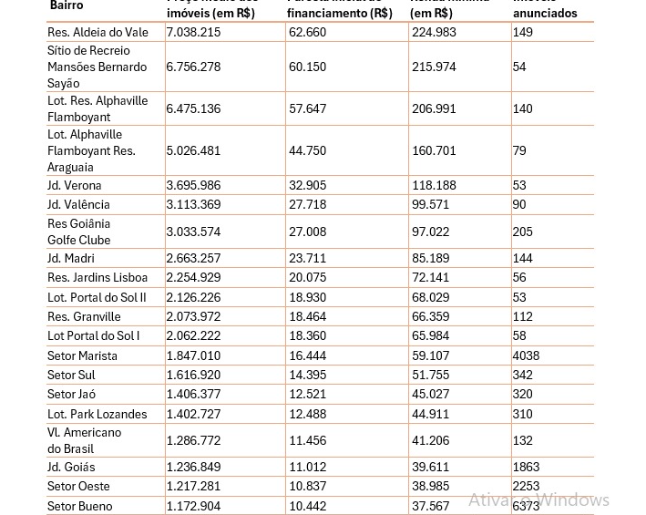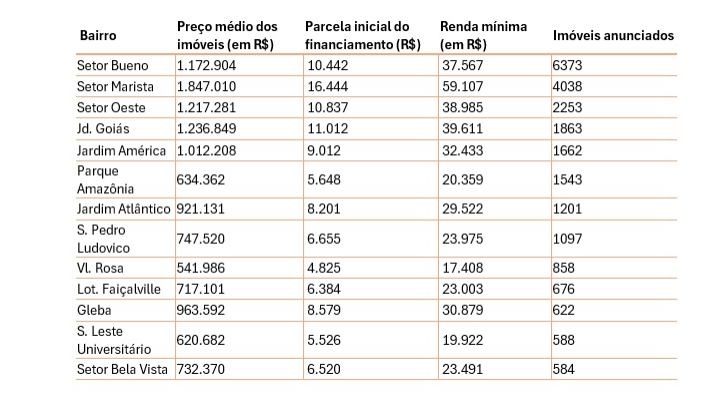 O estudo também revela os bairros com os imóveis mais caros de Goiânia. Em regiões como Aldeia do Vale, Alphaville Flamboyant e Jardim Verona, a renda mínima exigida para obter financiamento ultrapassa R$ 100 mil e pode chegar a R$ 225 mil.