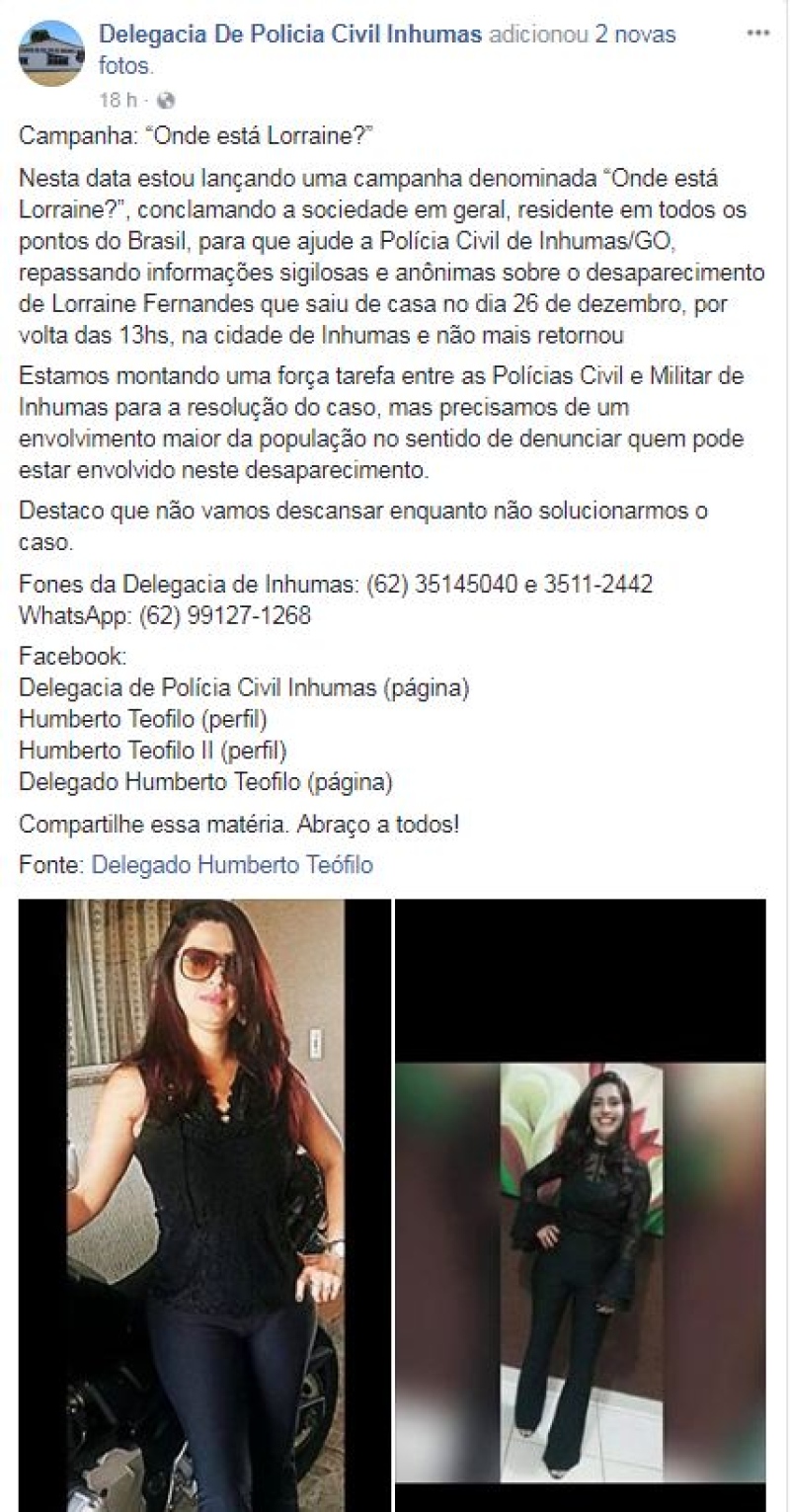A campanha “Onde está Lorraine?” foi compartilhada nas redes sociais da Delegacia de Polícia Civil de Inhumas. A mensagem fazia um apelo conseguir desvendar o mistério do sumiço da cabeleireira.