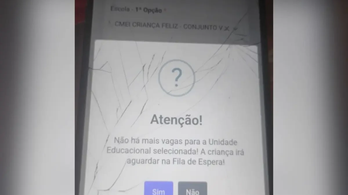 Cláudia tentou vaga para o filho de dois anos no CMEI Criança Feliz, no Conjunto Vera Cruz, mas a solicitação foi automaticamente direcionada para a fila de espera. Segundo ela, a criança ficou na 13ª posição, mesmo com a tentativa feita logo após o sistema voltar a funcionar.