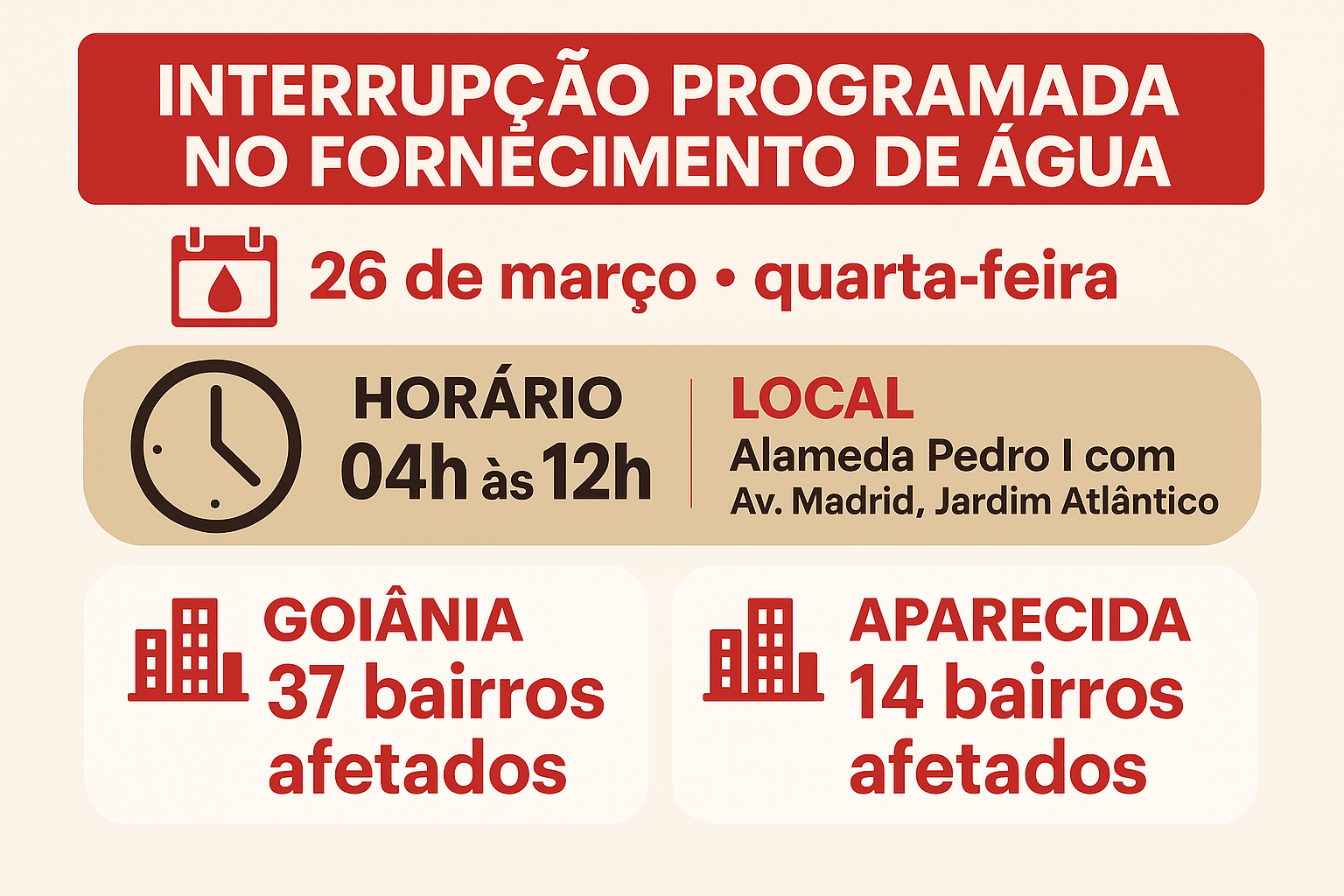 Uma manutenção programada pela Companhia de Saneamento Básico de Goiás (Saneago) deve deixar moradores de Goiânia e Aparecida sem água nesta quarta-feira (26/3). Os trabalhos serão realizados das 4h da manhã ao meio-dia, na Alameda Pedro I com Av. Madrid, Jardim Atlântico. Durante esse período, clientes poderão ficar sem o fornecimento de água e esgoto, com retorno gradual até o fim dos trabalhos.