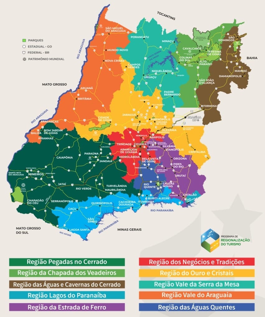 Na última segunda-feira (26), o Ministério do Turismo (Mtur), divulgou o novo Mapa do Turismo Brasileiro 2019-2021. Neste ano, 79 municípios de Goiás estão no mapa, distribuídos em dez regiões turísticas: Vale do Araguaia, Ouro e Cristais, Chapada dos Veadeiros, Negócios e Tradições, Pegadas no Cerrado, Estrada de Ferro, Lagos do Paranaíba, Águas e Cavernas do Cerrado, Vale da Serra da Mesa e Águas Quentes.