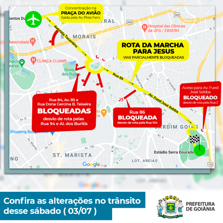 Para a realização da Marcha para Jesus, a Prefeitura de Goiânia confirmou que vai bloquear totalmente a rua 84, avenida 85 e rua Dona Gercina B. Teixeira. O desvio de rota será pela rua 94 e Alameda dos Buritis. Também ficarão totalmente bloqueadas a rua 96, que terá desvio pela eua 104, e o acesso para a avenida Fued José Sebba, que contará com desvio de rota pela rua 2.