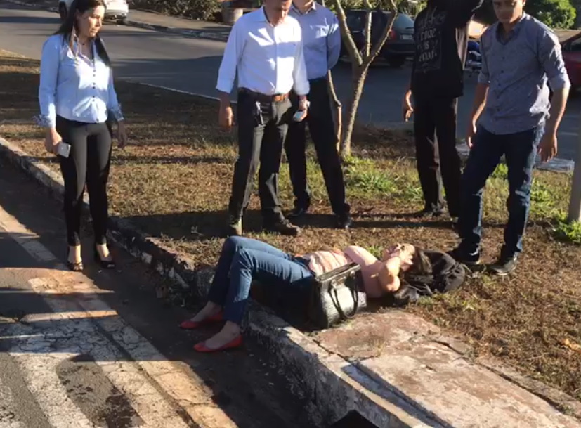 Após batida, mulher aguardou ambulância na grama de um canteiro central (Foto: divulgação/Leitor Mais Goiás)