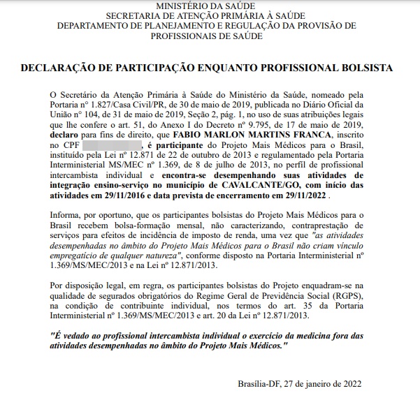 De acordo com a Secretaria, Fábio é integrante do Programa Mais Médicos desde 2016, “estando totalmente regular”. A pasta ressalta que o profissional possui os requisitos e registro necessário para a atuação pelo referido programa.