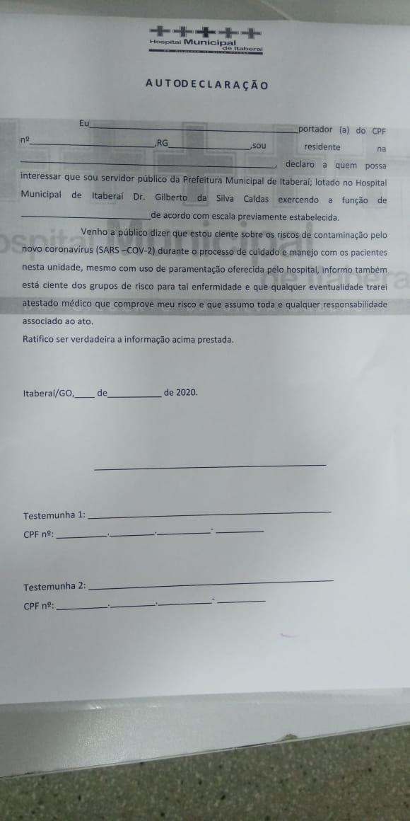 Ao Mais Goiás, médicos e enfermeiros disseram que a prefeitura solicitou deles que assinem um documento em que reconhecem total responsabilidade no caso de uma eventual contaminação por coronavírus. A assessora que falou com a reportagem disse que não sabia deste documento e que pedirá explicações à secretária de saúde. Atualizaremos a reportagem quando houver posição. Abaixo, segue o documento.
