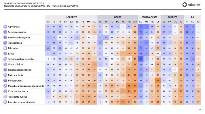 O índice foi construído a partir das entrevistas que o Atlas/Intel fez entre os dias 6 de outubro e 5 de dezembro de 2025, com 200.980 pessoas. Cada entrevistado teve que avaliar as áreas-chave em uma escala de cinco pontos, que varia de “péssimo” a “ótimo”. Cada ponto dessa escala atribui uma pontuação específica, permitindo a conversão da avaliação qualitativa em um indicador quantitativo.