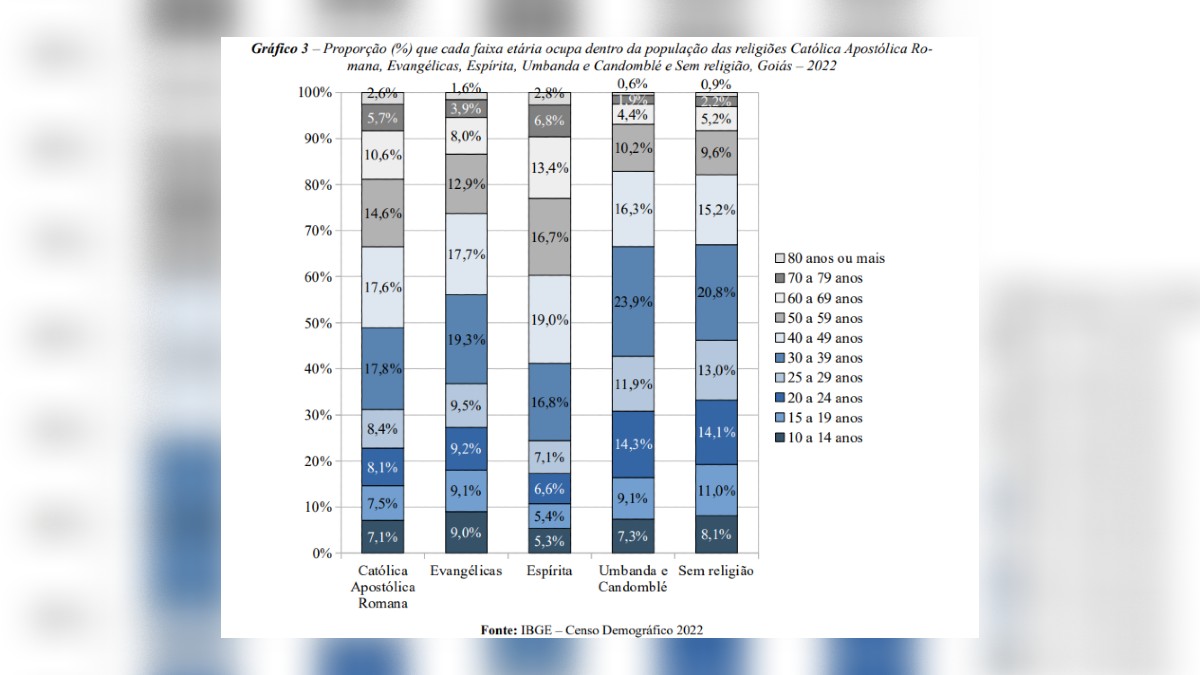 Dados do Censo 2022, publicados nesta sexta-feira (6) pelo Instituto Brasileiro de Geografia e Estatística (IBGE), mostram que, em Goiás, aproximadamente metade da população católica têm 40 anos ou mais. Esse grupo representa 51,1%. Nessa mais faixa de idade, os evangélicos representam 44,1% e os espíritas, 58,8%. Já os sem religião, 33,1%, enquanto umbanda e candomblé, 33,4%.