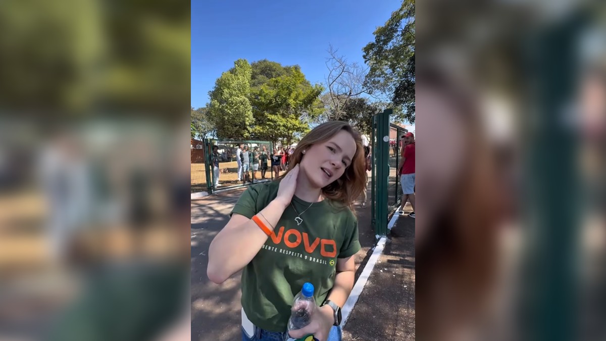 Em determinado momento, uma militante de outro espectro chega e tenta tomar a bandeira da presidente do Novo. “Vocês não merecem usar.” Ela também diz que “foi pouco”, se referindo à agressão.