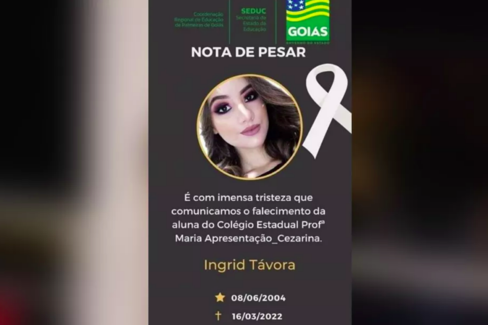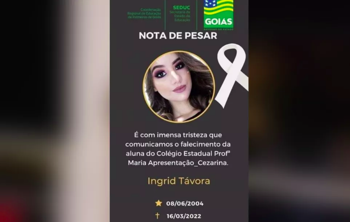 A Coordenação Regional de Educação de Palmeiras de Goiás, a qual o colégio onde ela estudava é vinculado, também publicou uma nota de pesar. “É com imensa tristeza que comunicamos o falecimento da aluna do Colégio Estadual Professora Maria Apresentação”, diz o comunicado.