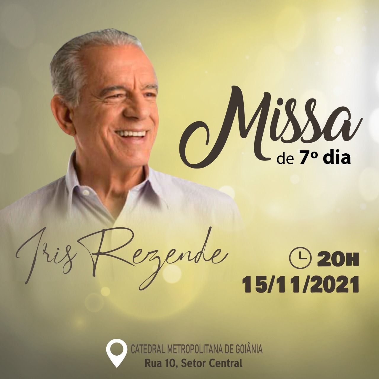 A missa de sétimo dia do ex-prefeito e ex-governador Iris Rezende (MDB) está marcada para às 20h desta segunda-feira (15). A cerimônia será realizada na Catedral Metropolitana Nossa Senhora Auxiliadora, na Rua 10, no Setor Central, em Goiânia, e é preparada pela equipe do arcebispo Dom Washington Cruz.
