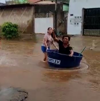 Apesar da situação preocupante, as pessoas que aparecem nas imagens ainda levam na brincadeira. Uma menina que acompanha a cena ainda grita “Eu também quero entrar” no “barco/caixa d’água”.