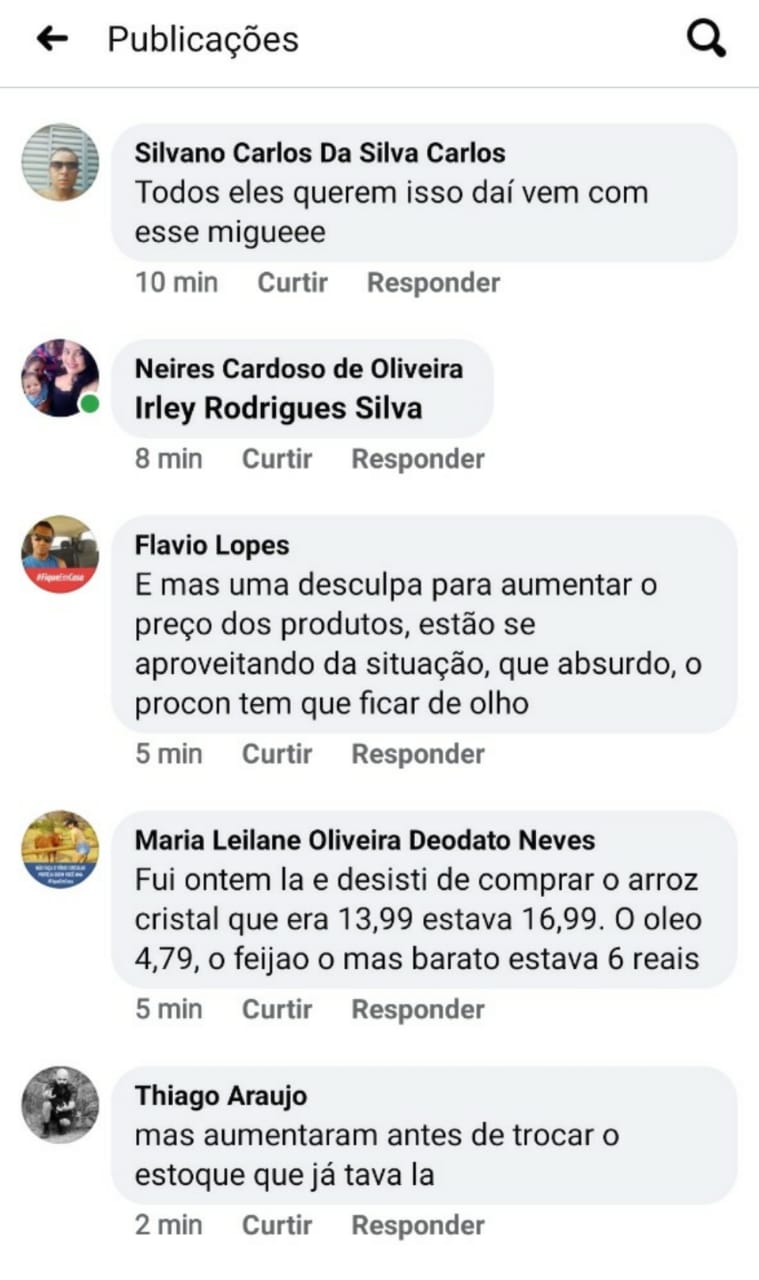 Em outro comentário, uma usuária afirma que, apesar de ser cliente dos supermercados da região há seis anos, irá procurar outros estabelecimentos para realizar as compras. “Não comprem em locais com preços abusivos. Meu dinheiro esses supermercados não vão ver mais”.