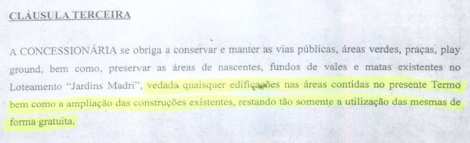 São vedadas, por exemplo, “quaisquer edificações em todas as outras áreas públicas deste condomínio, bem como a ampliação das construções existentes nas áreas descritas e aqui autorizadas para uso exclusivo”.