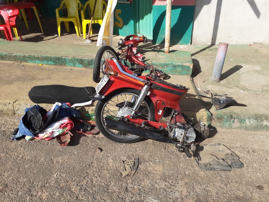 Moto atravessava uma rua, em baixa velocidade, quando um Renault Clio a atingiu partindo a moto em dois pedaços