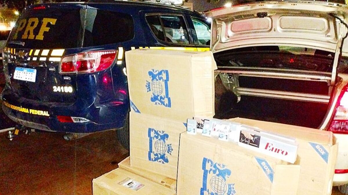 A Polícia Rodoviária Federal (PRF) apreendeu 5 mil maços de cigarros contrabandeados na BR-070, em Águas Lindas de Goiás, na tarde de quarta-feira (18). O condutor e um ocupante foram levados com os produtos e o carro, que estava irregular, para a Superintendência da Polícia Federal do Distrito Federal.