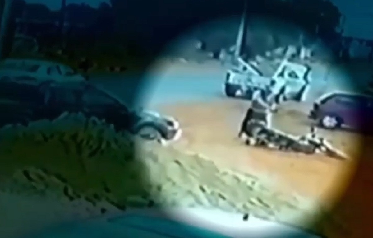 As imagens mostram a caminhonete preta derrubando o motociclista em um terreno baldio. O homem sai andando e gesticula alguma coisa para o motorista agressor, que sai do veículo.