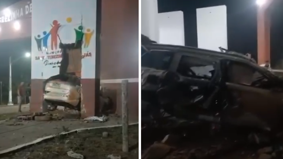 Um motorista morreu depois de bater um carro de luxo contra o portal da cidade de Santa Terezinha de Goiás, no norte do estado, na noite desta terça-feira (23). Imagens mostram o veículo preso entre o concreto e com a frente completamente destruída.