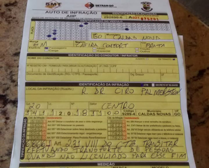 Um motorista de aplicativo ficou sem o veículo que aluga, um Chevrolet Zafira, depois que a prefeitura de Caldas Novas, por meio da Secretaria Municipal de Trânsito (SMT), deflagrou uma operação para coibir o transporte irregular de passageiros na cidade durante o feriado prolongado e o evento Caldas Country, iniciado na quarta-feira (14) e que segue até domingo (18). Agora, o condutor terá que aguardar até essa última data para recolher o carro no pátio da SMT. Conforme expõe o superintendente do órgão, Leonardo Marinho de Melo, a intenção é “apreender muitos mais”, desde que fique caracterizado o “transporte clandestino”.