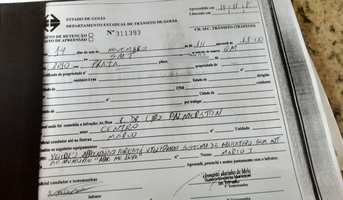 Porém, em ligação com o advogado, o superintendente afirmou que apenas o transporte acionado por meio de aplicativo seria monitorado. “Vamos combater apenas aplicativo”. Além disso, o Mais Goiás teve acesso a uma documentação (foto), assinada por Leonardo, no qual o agente de trânsito reconhece que a situação trata-se de uma apreensão. Ouça um trecho do diálogo entre ele e o advogado: